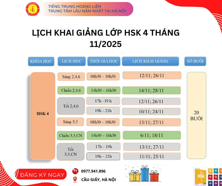 Lịch khai giảng chương trình HSK 4 cho các bạn tham gia đăng ký học tiếng trung tại trung tâm tiếng trung Hoàng Liên như sau để các bạn có thể theo dõi đăng ký học. và các bạn gọi điện đến trung tâm để được tư vấn chi tiết hơn về khóa học