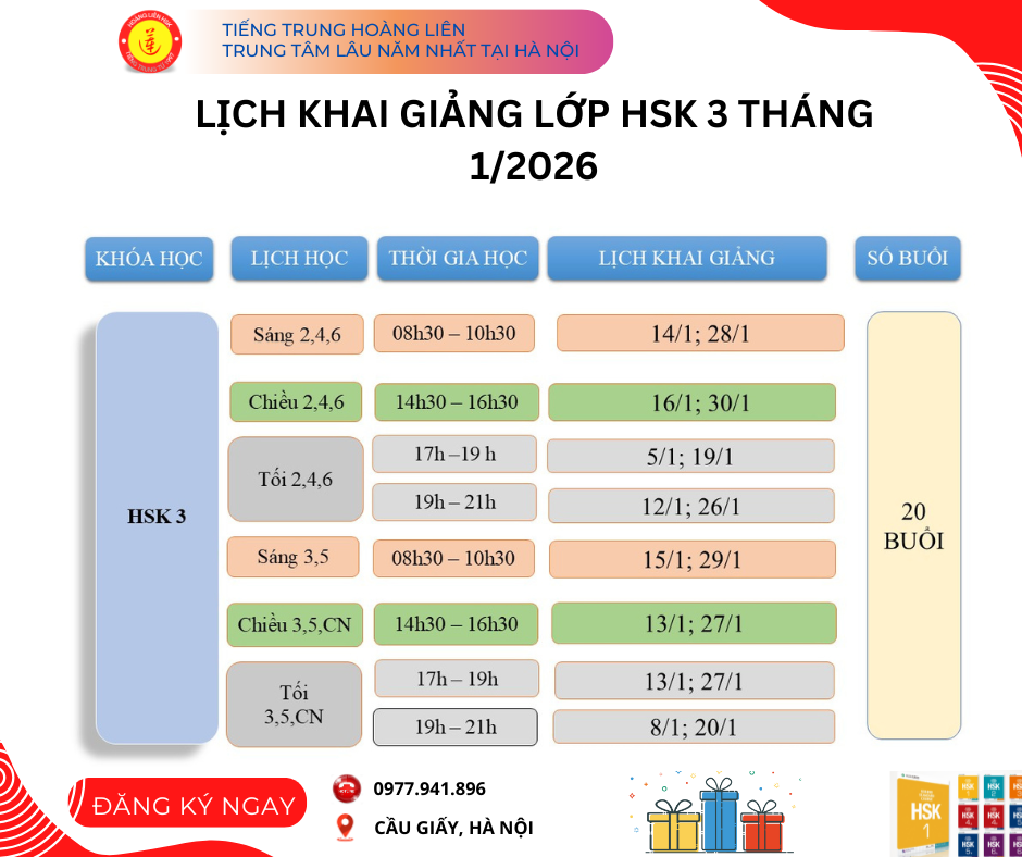 Khi tham gia đăng ký học chương trình chuẩn HSK 3, các bạn theo theo dõi lịch khai giảng như sau tại trung tâm tiếng trung Hoàng Liên: