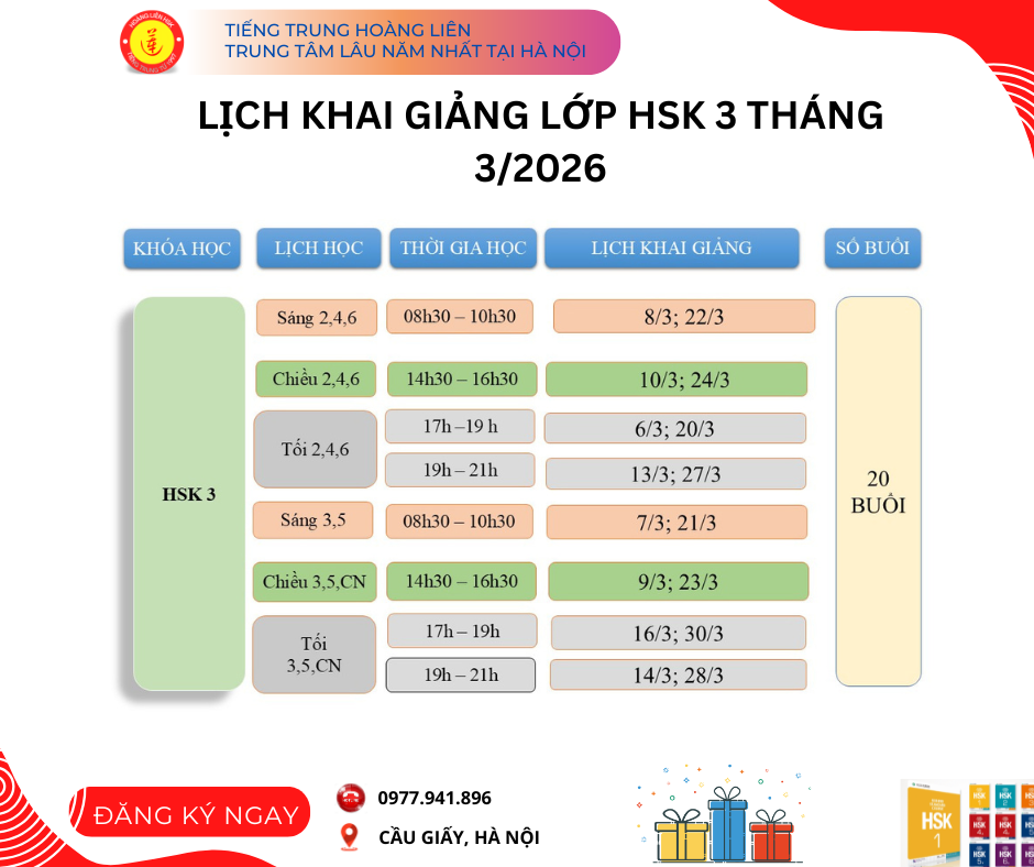 Khi tham gia đăng ký học chương trình chuẩn HSK 3, các bạn theo theo dõi lịch khai giảng như sau tại trung tâm tiếng trung Hoàng Liên: