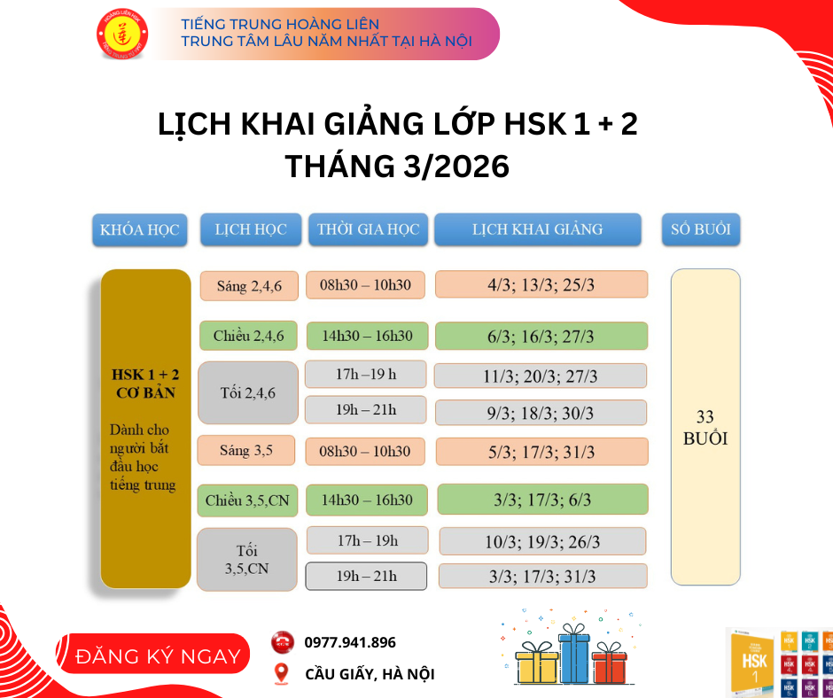 Trung tâm tiếng trung Hoàng Liên gửi đến bạn học tiếng trung lịch khai giảng khóa học tiếng trung dành cho các bạn chưa biết gì về tiếng trung tại trung tâm. Khóa học HSK 1 và HSK 2 được trung tâm thiết kế để các bạn có thể làm quen và học tiếng trung một cách đơn giản, dễ hiểu nhất, theo bộ giáo trình chuẩn HSK từ 1 đến 6, bộ giáo trình được đánh giá là hiện đại và sát với các đề thi lấy chứng chỉ HSK quốc tế nhất hiện nay.