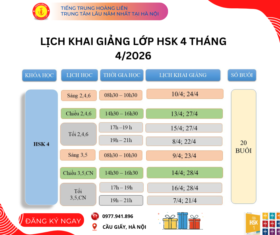 Lịch khai giảng chương trình HSK 4 cho các bạn tham gia đăng ký học tiếng trung tại trung tâm tiếng trung Hoàng Liên như sau để các bạn có thể theo dõi đăng ký học. và các bạn gọi điện đến trung tâm để được tư vấn chi tiết hơn về khóa học